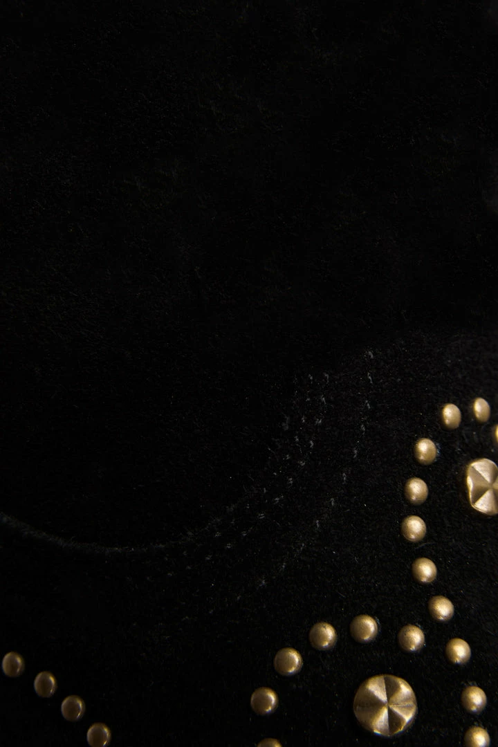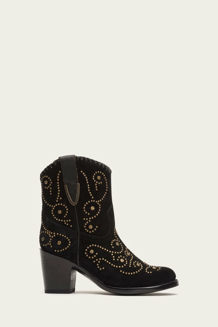 Decorative details deliver cowgirl cool. Handcrafted from rich oiled Italian suede, this pull-on boot with sturdy mid heel features all-over brass studs and brass pull-tab detailing for added western flair. – Italian leather